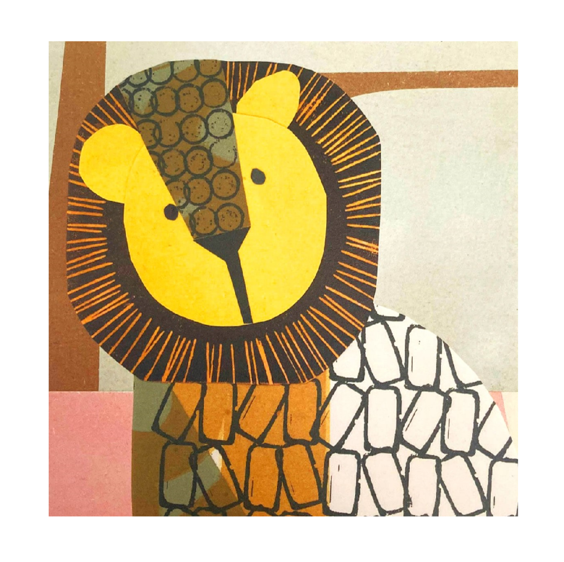 Greeting card bearing artwork 'Lionel' by Anne Davison. Mixed media collage.