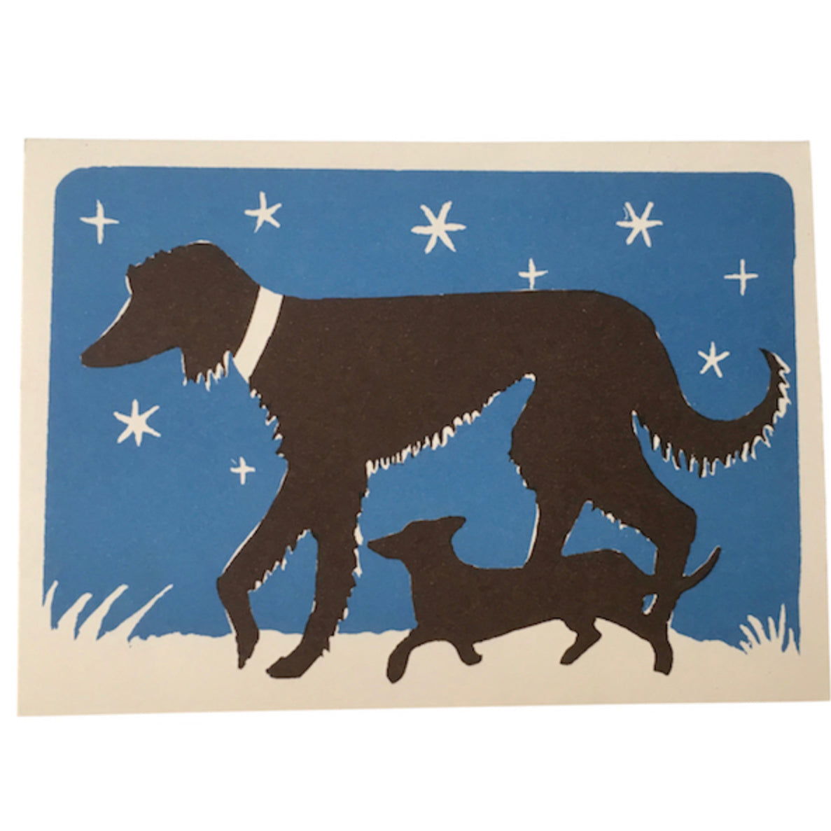 Cambridge Imprint greeting card with one big dog and one little dog walking together at night.