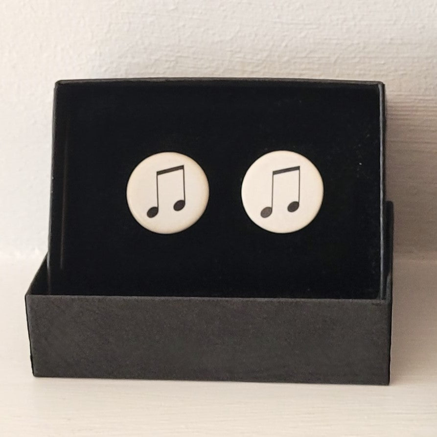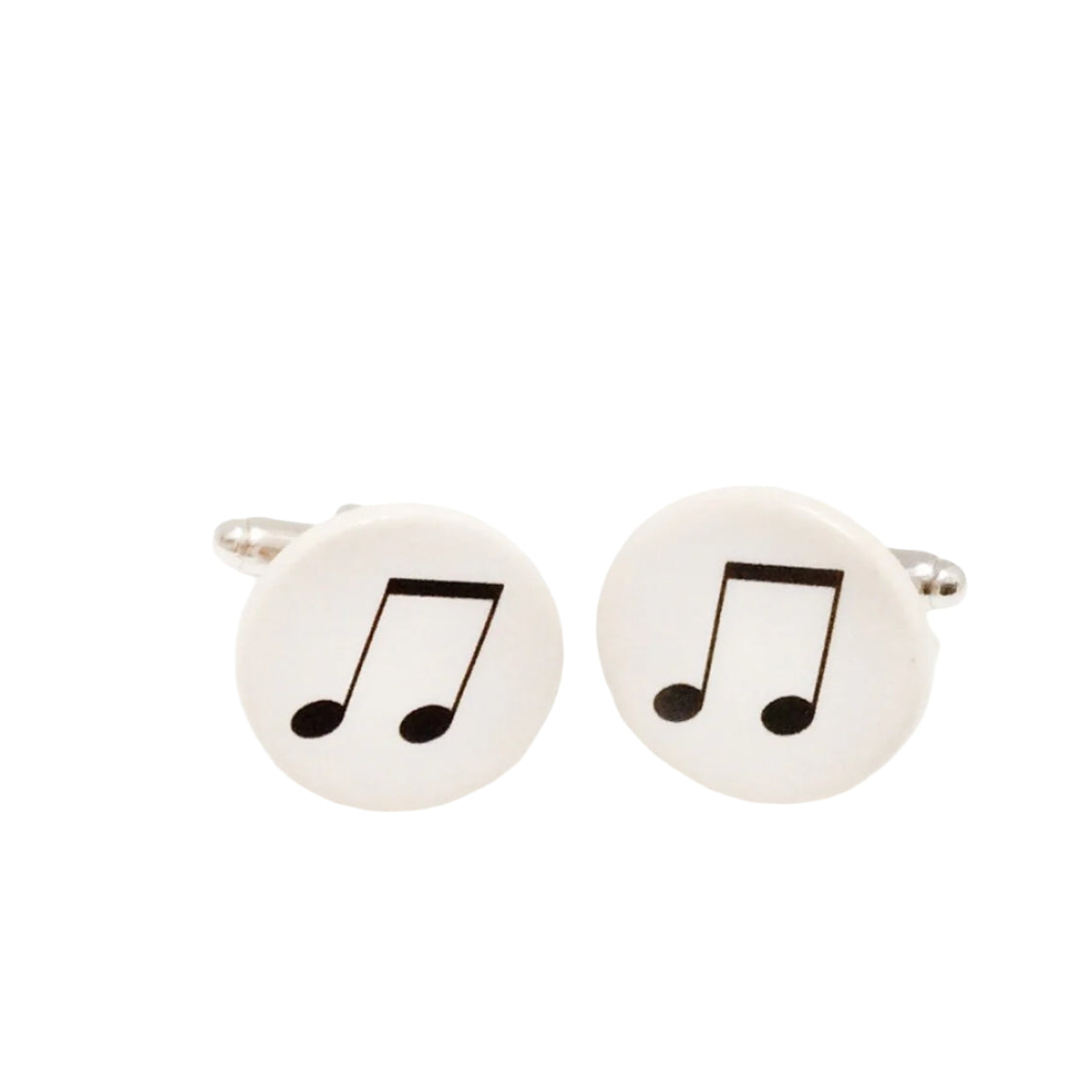 White ceramic cufflinks 20mm diameter featuring black musical notes. Handmade in the U.K. Perfect gift for any musician or music lover.