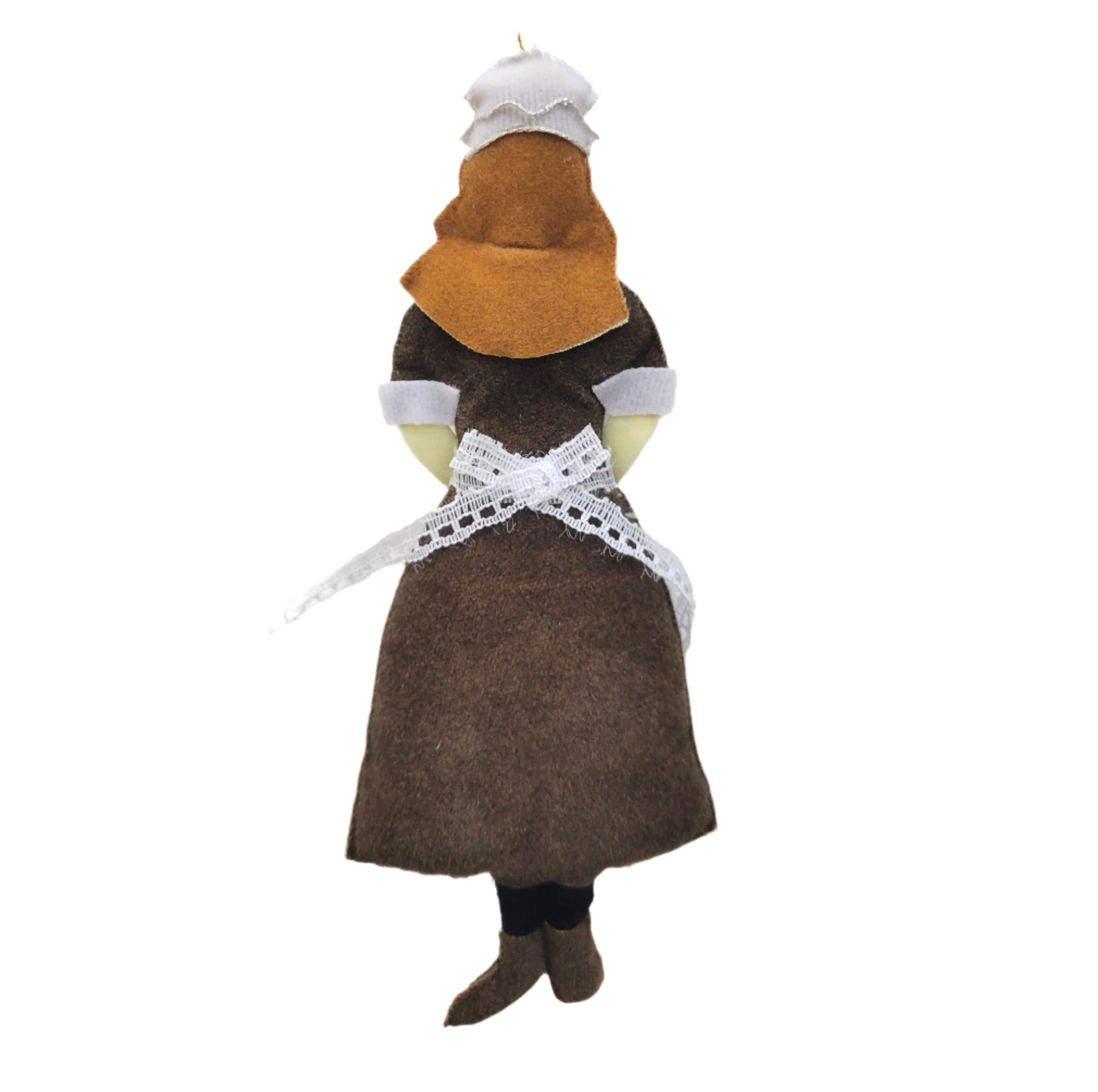 This handstitched hanging decoration of a Foundling girl, dressed in her iconic brown uniform, carries a special keepsake - her handkerchief embroidered with the initials "FM" - a charming reminder of your visit to the Foundling Museum!