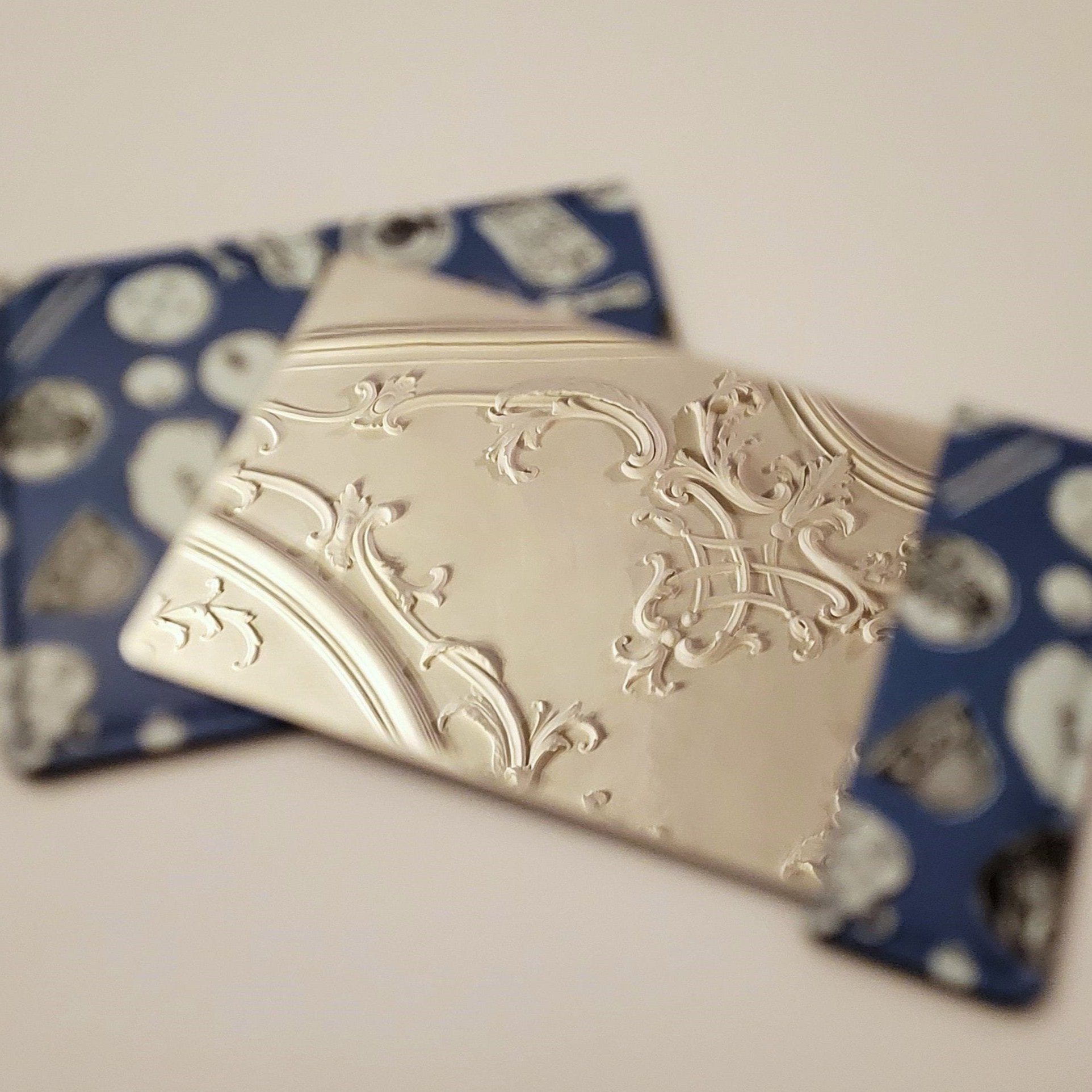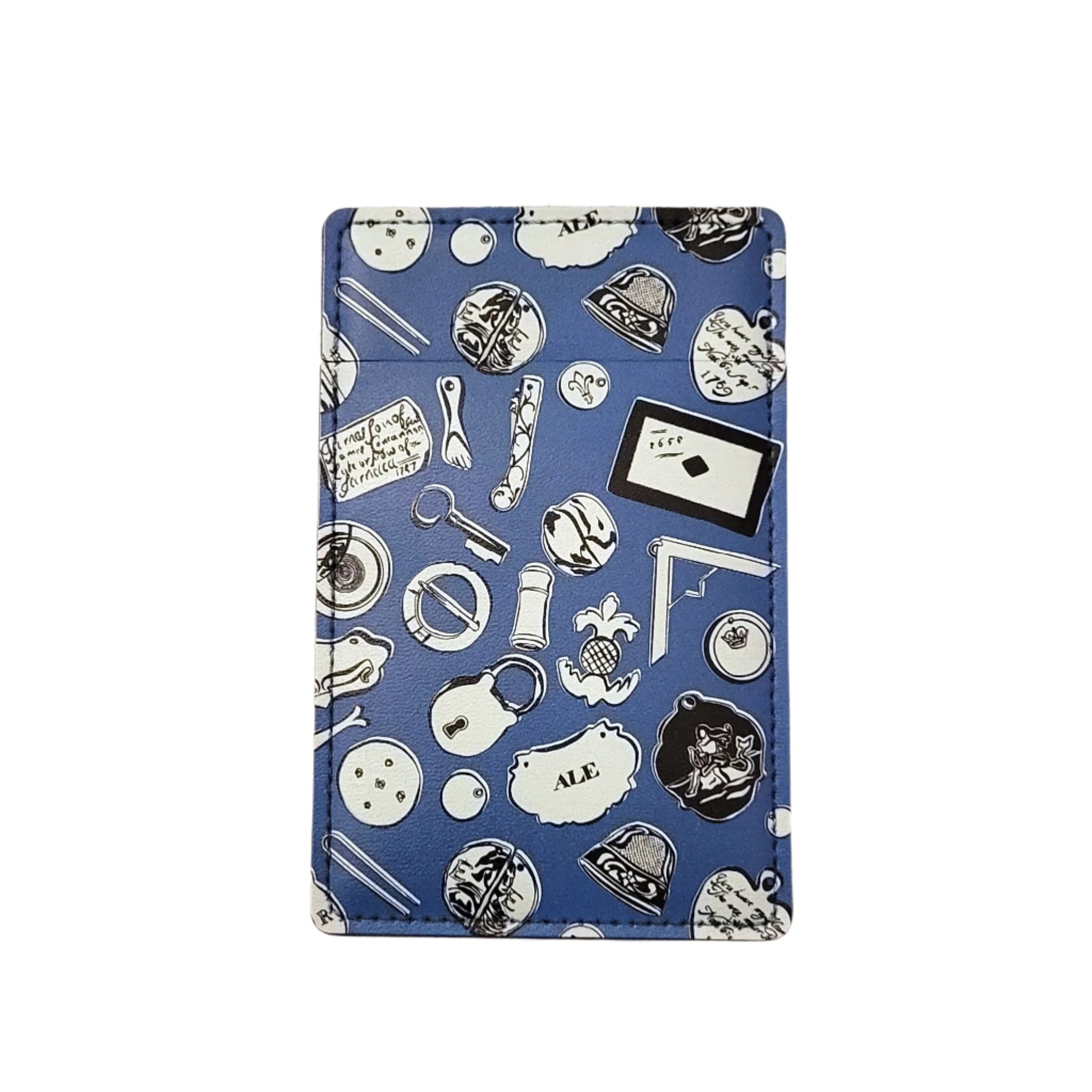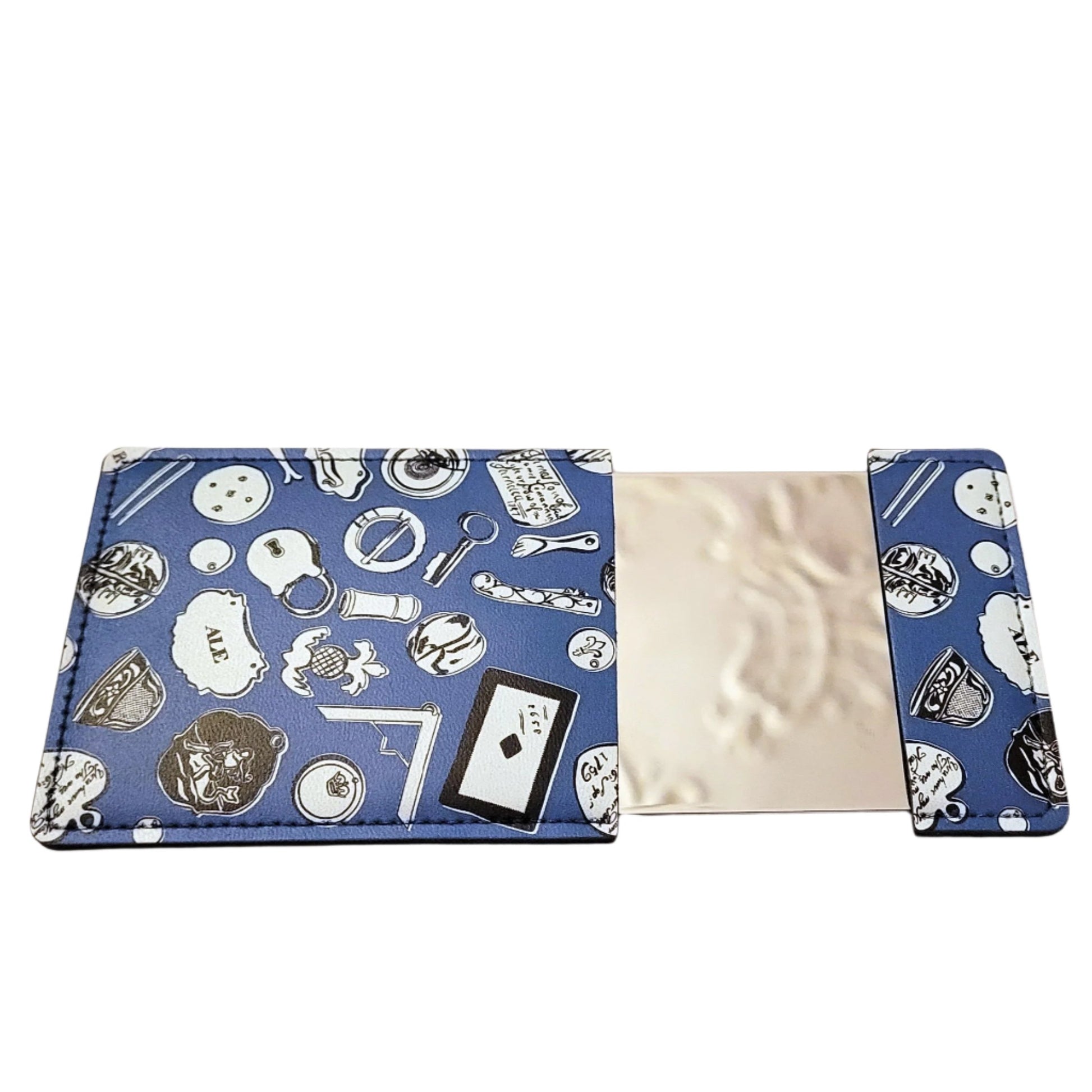 A pocket mirror in a slick little pouch, featuring a design of the Foundling Museum's tokens collection.